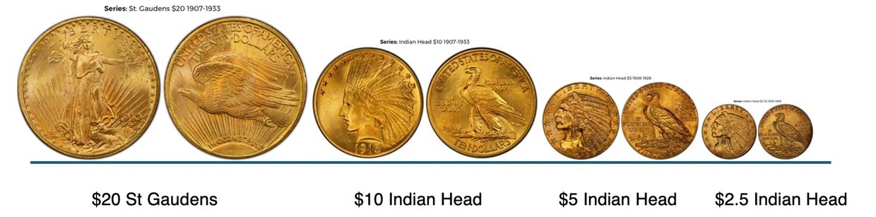 The 4-piece Indian/St. Gaudens set — in Certified Mint Condition. Each set contains 1.82 ounces of gold and includes: